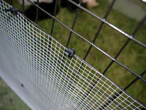 With some input from the engineers at the Egg Yolk , I eventually decided that a hardware cloth overlay that extended up 24” with a 12” apron along the perimeter of the pen would close the gaps in the welded wire fence to a very small size. Small enough to block crafty raccoon fingers? I very much hoped so. It took me many hours on my hands and knees to attach the darn thing with military-grade UV-resistant cable ties (that’s what it says on the package, who knows?!) In the middle of the night on the eve of my planned First Outside Sleepover for the ducks, however, I began to worry that the raccoons might still be able to get their claws through even this tiny opening. Not to do real harm but even poking might disturb my babies. Can you look up “length of a raccoon claw” on the Internet?** I wasn’t sure but at 3 AM seriously considered trying! Instead, I told myself I would use heavy-duty clear plastic (the kind used for industrial shelving) to the inside bottom edges of the pen. I could hole-punch and attach it with yet more cable ties. (I think we’ve used over 300 on this project so far. Should have bought a case and saved some bucks!)